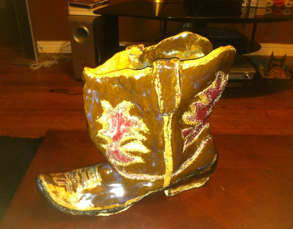 Cowboy boot made from clay and glazed